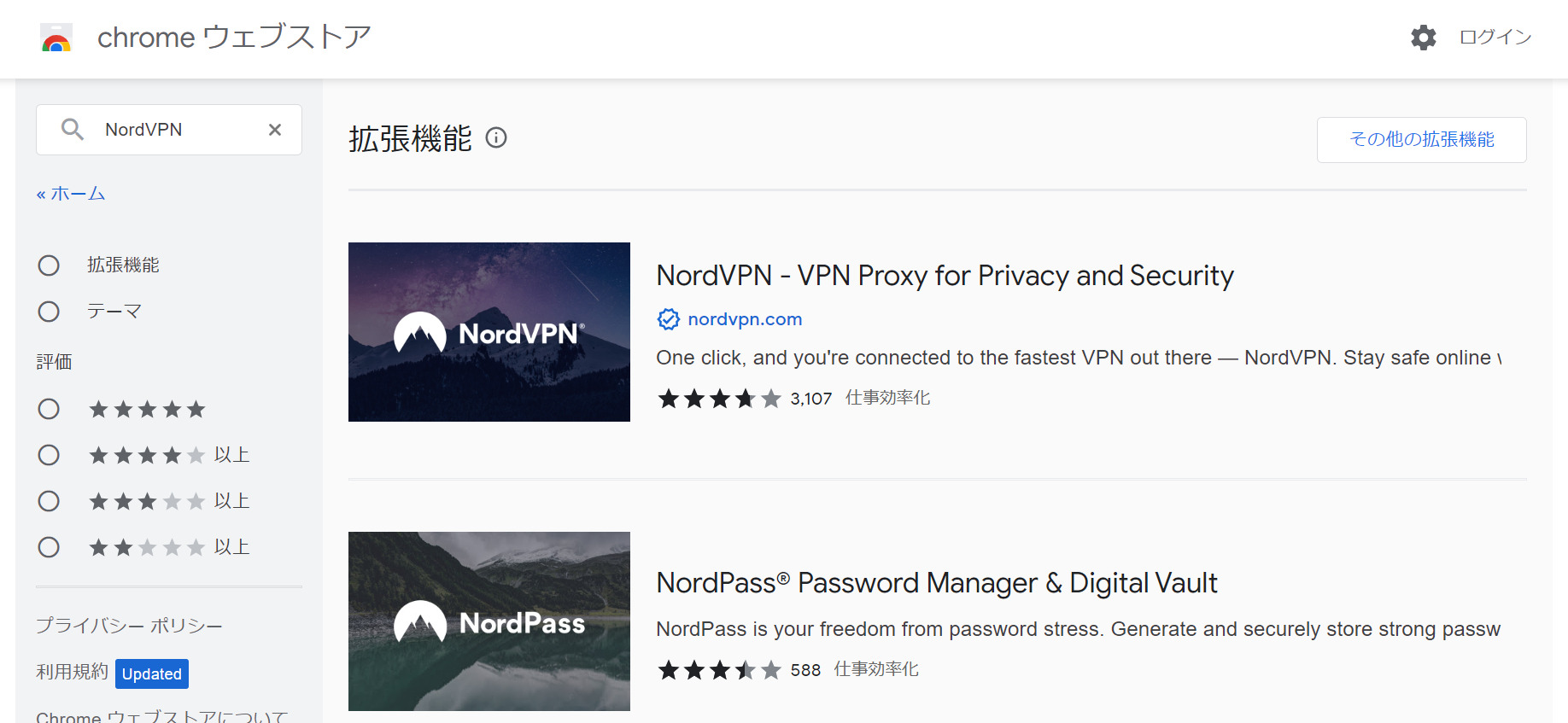 左上に検索ボックスがあるので、インストールしたい拡張機能の名称を入力します(ここでは”NordVPN”で検索してみます)